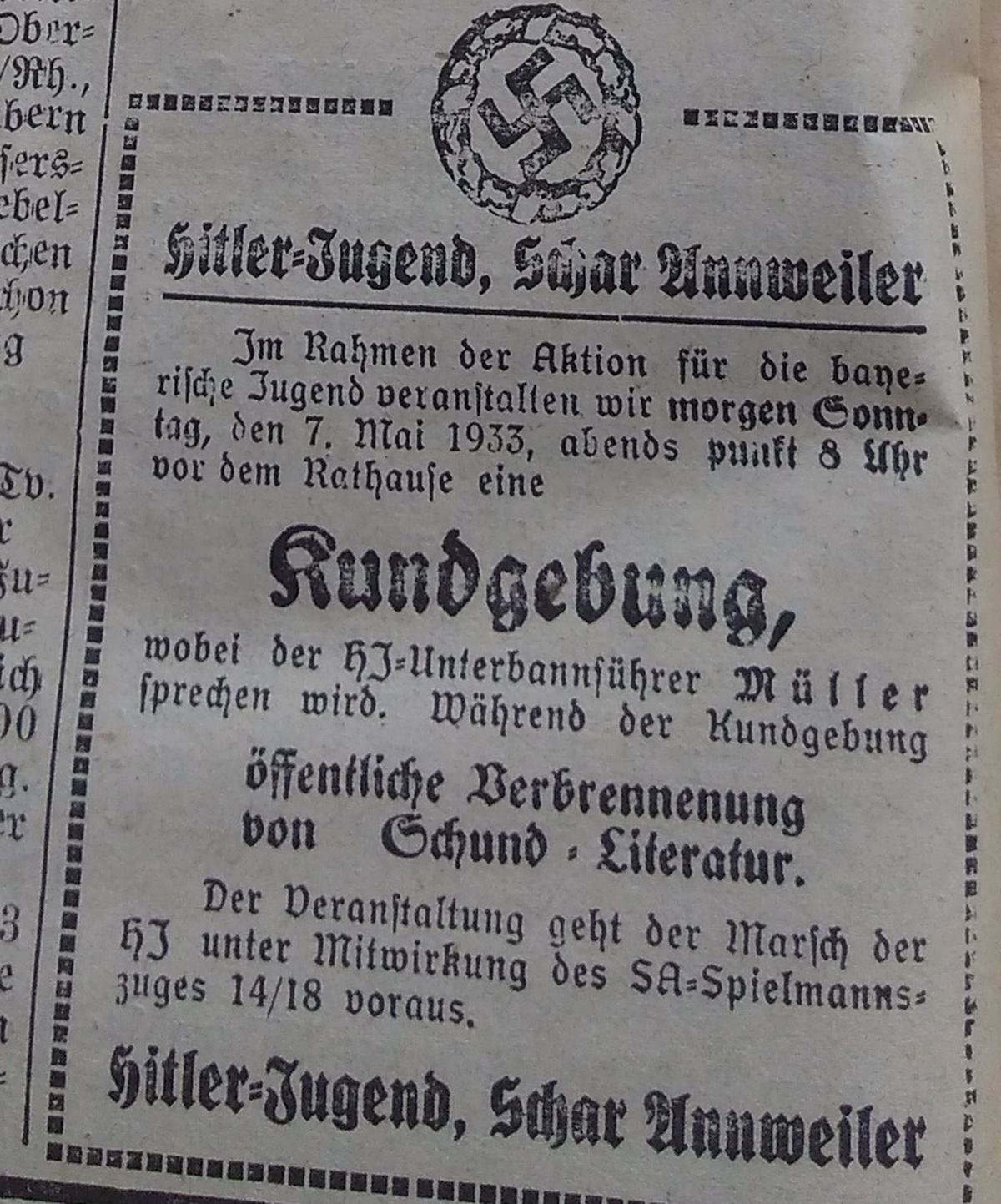 Schon im März 1933 wurde mit der Säuberung der Stadtbücherei begonnen. Immer wieder wurden neue Bestände an marxistischer und verfemter Literatur entdeckt. Am 8. Mai 1933 fand dann "in Anwesenheit einer großen Zuschauermenge" die Verbrennung der, aus der Stadtbücherei entfernten, Literatur statt.