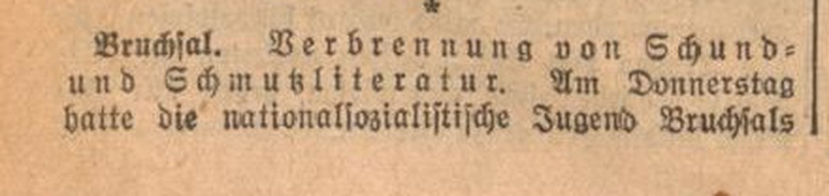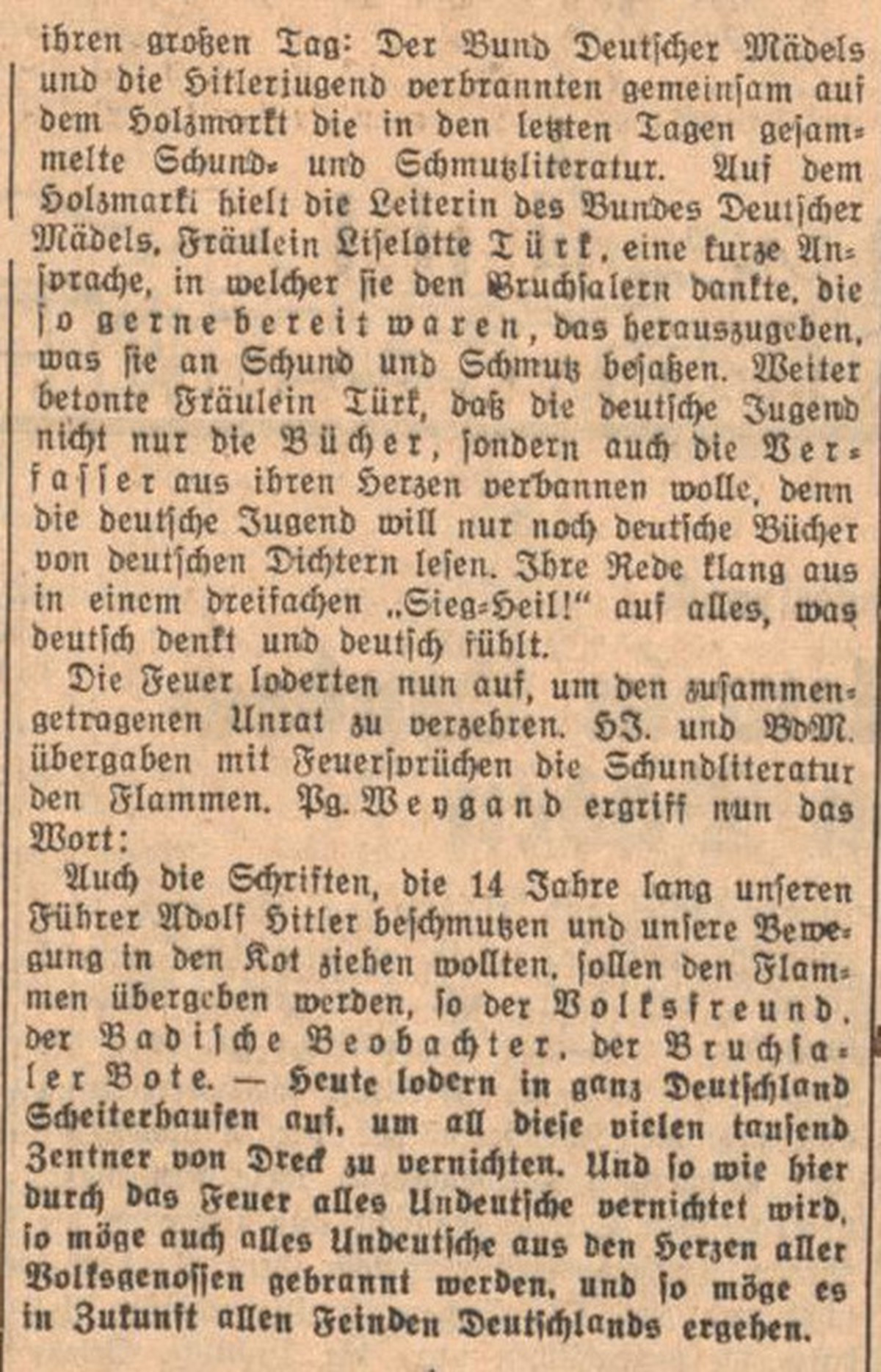 Auch in Bruchsal waren HJ und BDM maßgeblich für die Bücherverbrennung verantwortlich. In den Tagen vor der Verbrennung sammelten sie Bücher verfemter Autor*innen um sie dann am 22. Juni zu verbrennen.