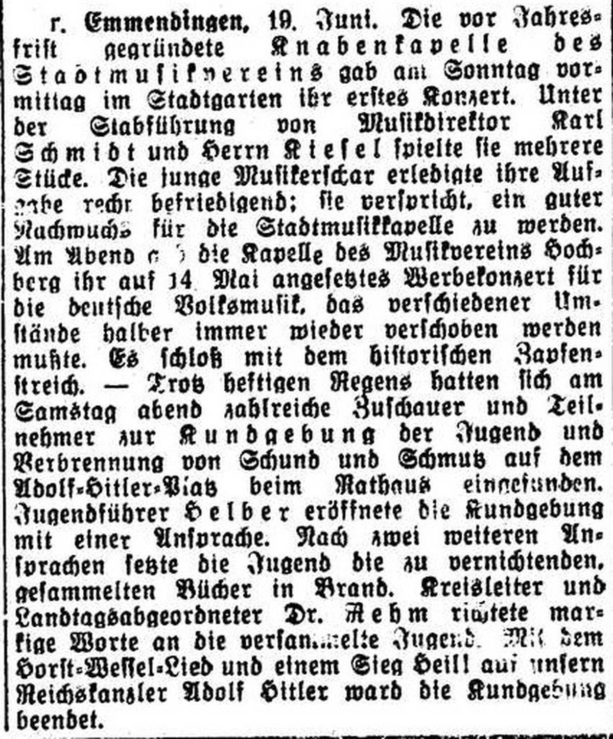 Bei strömenden Regen fand, im Rahmen der "Kampfwochen gegen Schmutz und Schund", die Bücherverbrennung durch die HJ statt.