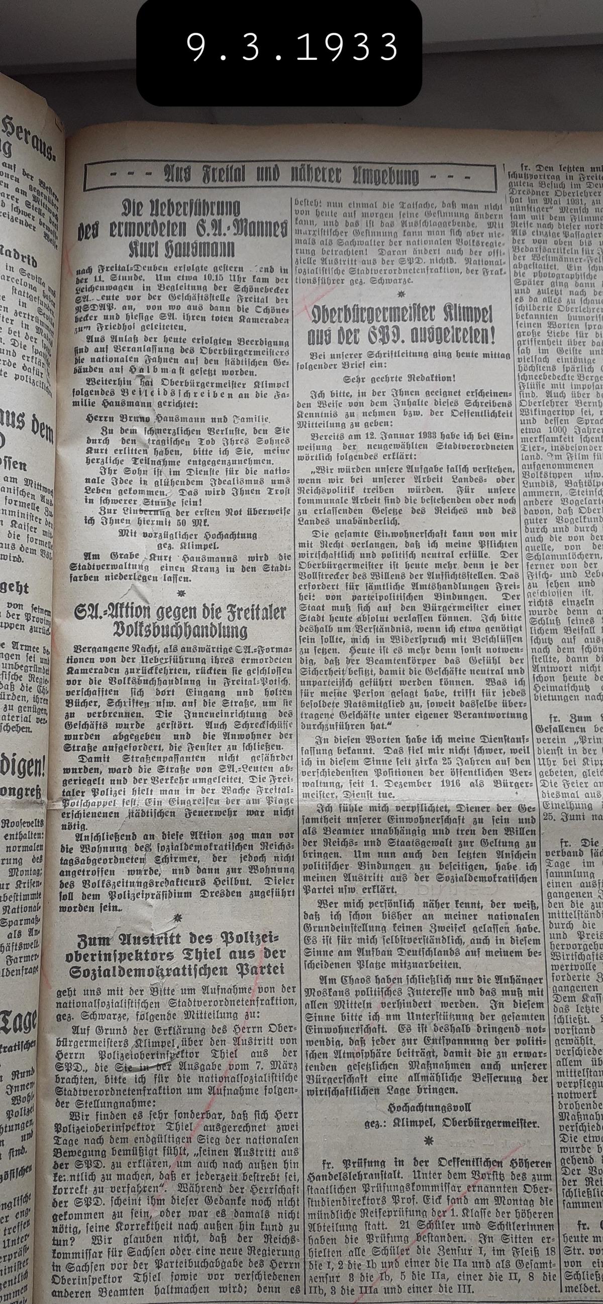 Nach der Beisetzung des SA-Mitglieds Kurt Hausmann wurde die Freitaler Volksbuchhandlung gestürmt. Die SA verbrannte die Bücher und gab Schreckschüsse ab.