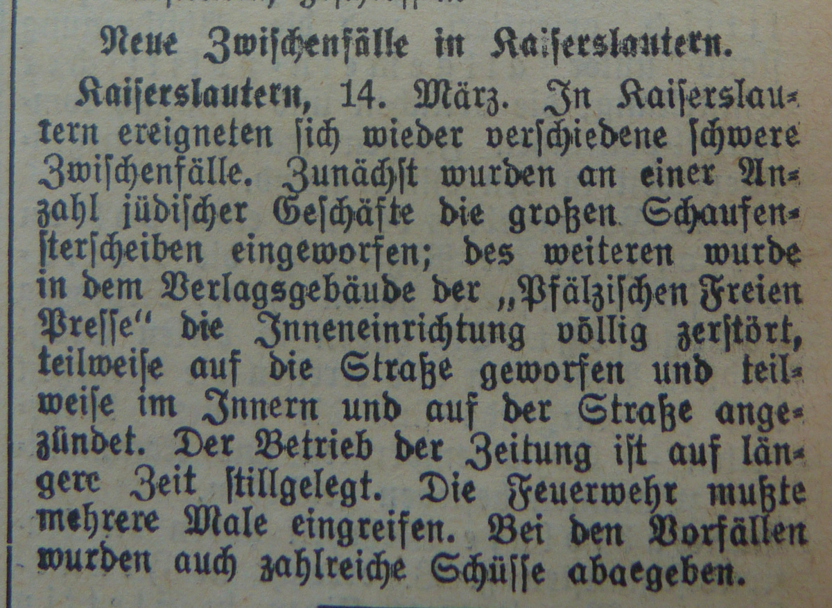 Im Rahmen mehrere Angriffe auf jüdische und kommunistische Einrichtungen durch die SA, wurde auch das Verlagsgebäude der "Freien Presse" gestürmt und verwüstet. Vorgefundene Zeitungen und anderes Inventar wurden auf die Straße geworfen und verbrannt.