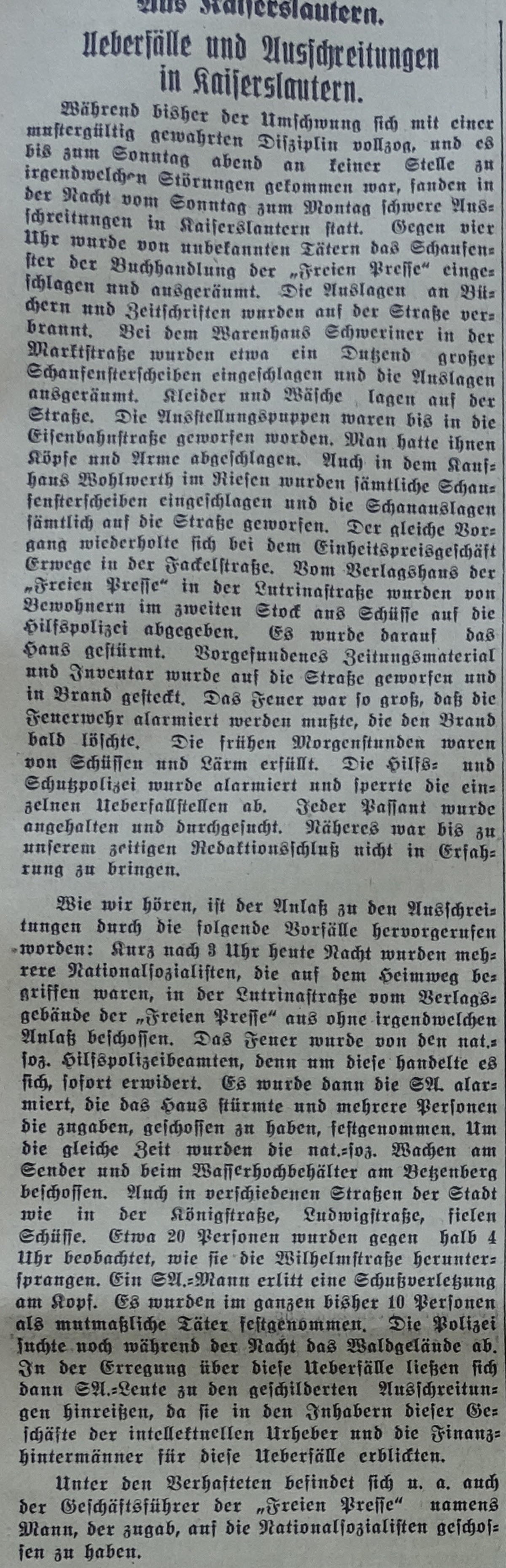 Im Rahmen mehrere Angriffe auf jüdische und kommunistische Einrichtungen durch die SA, wurde auch das Verlagsgebäude der "Freien Presse" gestürmt und verwüstet. Vorgefundene Zeitungen und anderes Inventar wurden auf die Straße geworfen und verbrannt.