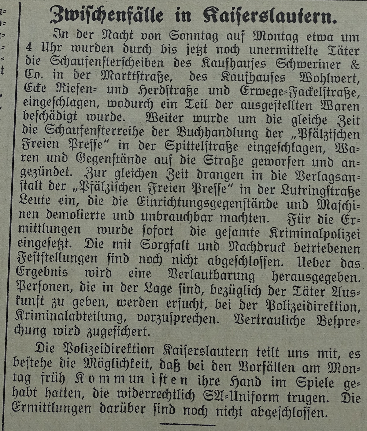 Im Rahmen mehrere Angriffe auf jüdische und kommunistische Einrichtungen durch die SA, wurde auch das Verlagsgebäude der "Freien Presse" gestürmt und verwüstet. Vorgefundene Zeitungen und anderes Inventar wurden auf die Straße geworfen und verbrannt.