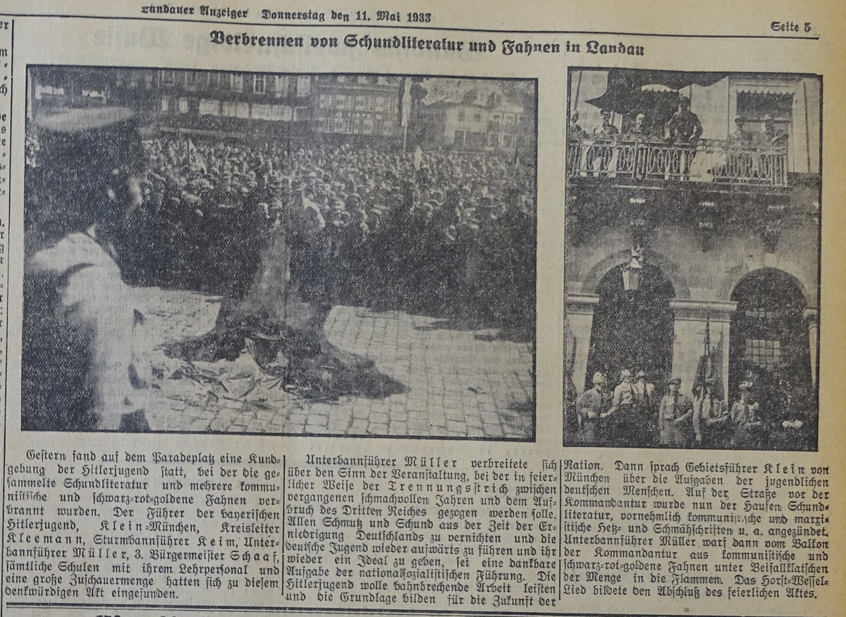Unter dem Beisein von mehreren Hundert Landauern fand die Bücherverbrennung am 10.Mai statt. Hauptakteur war hier die HJ.