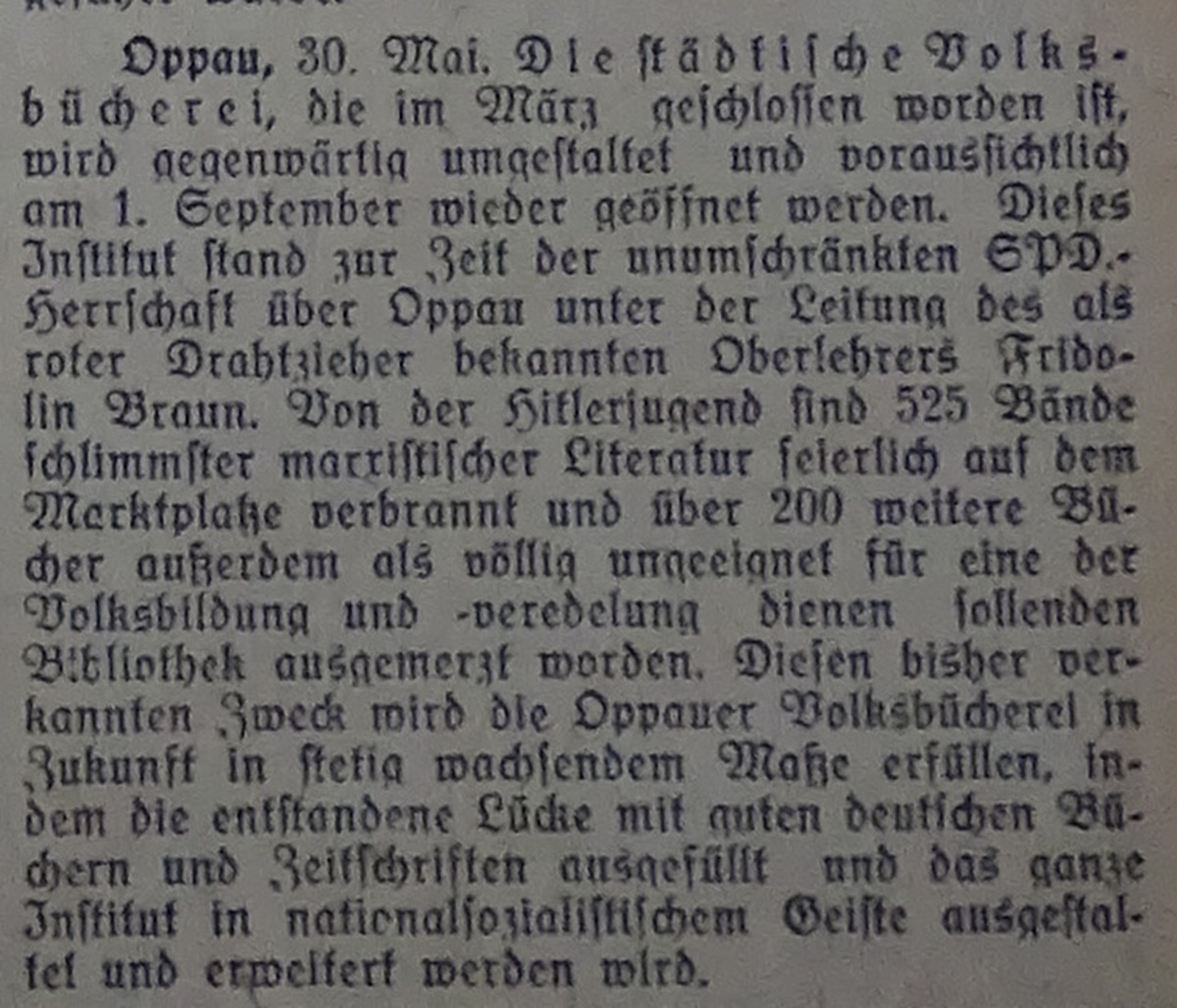 Im Rahmen einer Jugendkundgebung fand in Oppen eine Verbrennung "antideutscher Literatur" statt. Aus der Stadtbücherei würden 525 Bücher ausgewählt und im Beisein einer großen Menschenmenge verbrannt. Während der Verbrennung sangen die Menschen das Horst-Wessel- und das Deutschland-Lied