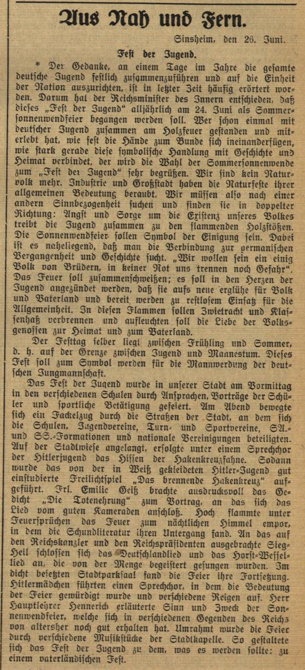 Nachdem tagsüber das "Fest der Jugend" an verschiedenen Schulen gefeiert wurde, kam es am Abend, im Rahmen einer Sonnenwendfeier, zu einer Bücherverbrennung auf der Stadtwiese.