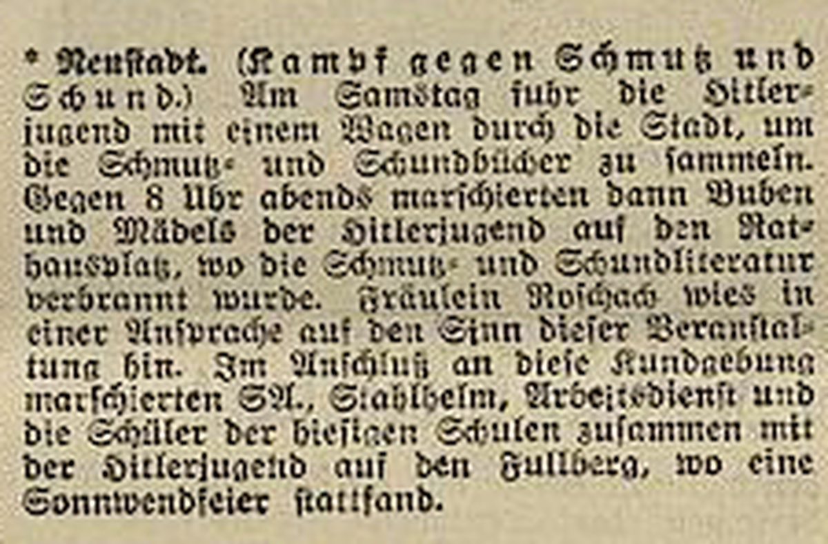 Tagsüber sammelte die HJ die Bücher verfolgter Autor*innen. Am Abend kam es auf dem Rathausplatz zu einer Bücherverbrennung. Danach zog die HJ zusammen mit SA, Stahlhelm, Arbeitsdienst und Schüler*innen auf Fullberg zu einer Sonnenwendfeier.