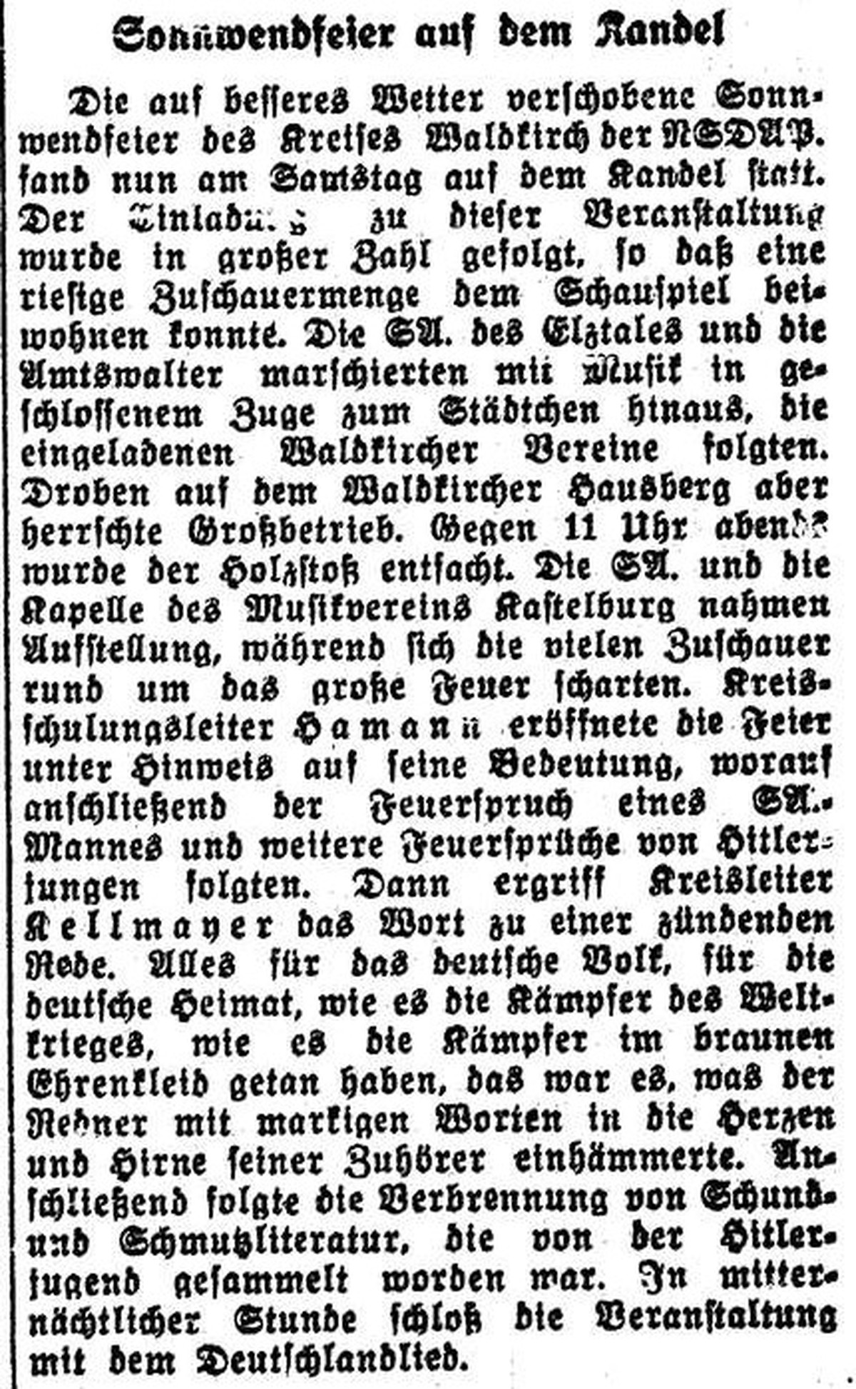 Mehrmals verschoben werden musste die Bücherverbrennung in Waldkirch. Schon 3 Wochen vorher wurden die Bücher von der HJ in Waldkirch eingesammelt. Organisiert wurde die Verbrennung von der Ortsgruppe der NSDAP. Auf dem Gipfel des Kandel wurde im Rahmen der Sonnenwendfeier und des Kreistreffens der SA, die Bücherverbrennung durchgeführt.