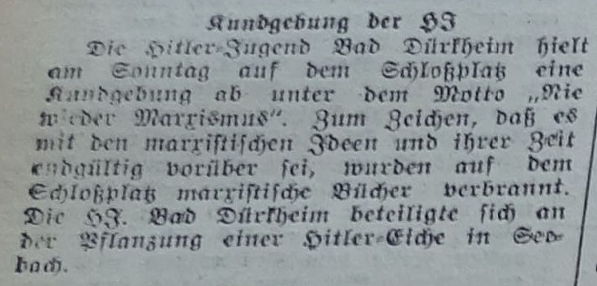 The Hitler Youth held a rally on the Schlossplatz under the motto "Never again Marxism". At this, Marxist literature was burned.
