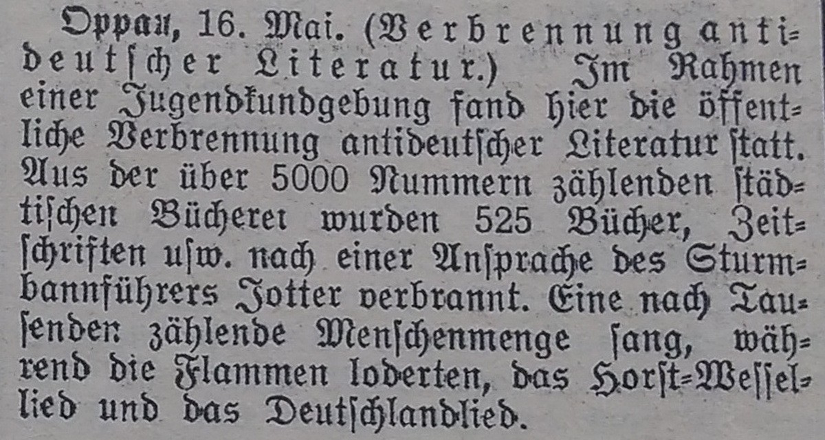 As part of a youth rally in Oppen, "anti-German literature" was burned. 525 books would be selected from the city library and burned in the presence of a large crowd. During the cremation, people sang the Horst Wessel Song and the Germany Song