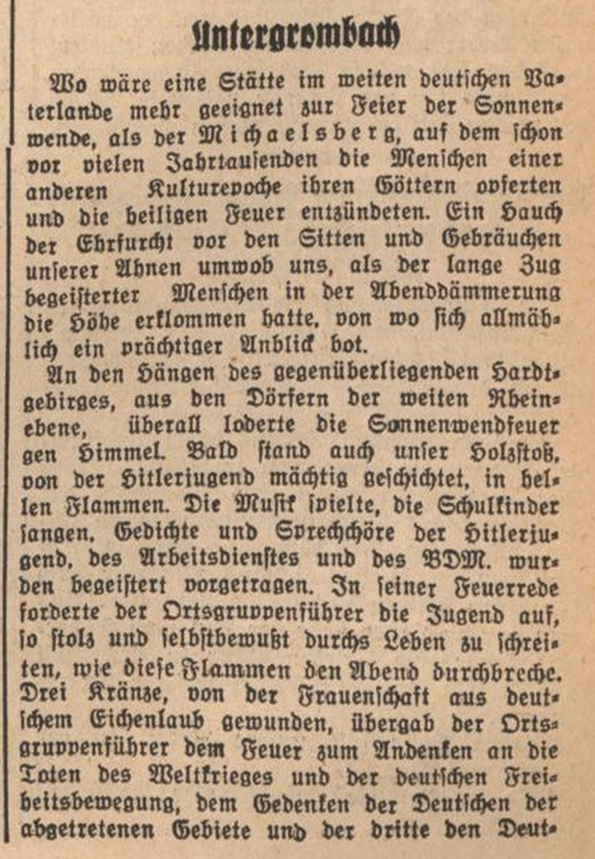 The book burning in Untergrombach took place as part of a solstice celebration. After a "procession" to the Michaelsberg, the pyre was lit there. Books previously collected by the Hitler Youth were burned.